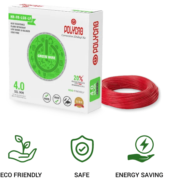 The Power of Green: With the rise in global warming the world needs wires that are eco-friendly, safe and delivering high performance. Combining breakthrough engineering with meticulously selected materials, Polycab has introduced ‘Green Wires’ conforming to stringent European norms in environmental sustainability and cable safety. The Polycab Green Wire is energy efficient, recyclable, is RoHS compliant, has low smoke density and emits fewer toxic gases in extreme fire situations, thus making it the preferred choice for Green Buildings.